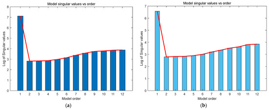The model order and singular value logarithm under two identification algorithms. (a) N4SID algorithm; (b) PCA-N4SID algorithm.