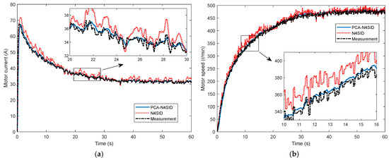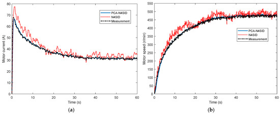The model state identification results for when the input information contains 2% noise pollution are shown in Figure 7. The model state identified based on the N4SID algorithm shows that during the process of starting and accelerating the motor to a steady and uniform speed, the deviation of the motor current model is relatively large in the initial stage. This is because at the moment of motor start-up, the motor current increases sharply, the numerical fluctuation is relatively large, and then the motor speed also changes rapidly. In this state, the input of the model is relatively unstable, leading to deviations in the identification results of the model state. When the motor speed is stable, the accuracy of the identification model is relatively higher. Relatively speaking, the identification algorithm based on PCA-N4SID has higher accuracy throughout the entire process of motor start-up and has a stable trend, reflecting that the PCA-N4SID algorithm can suppress the negative impact of input signal fluctuations on model accuracy.