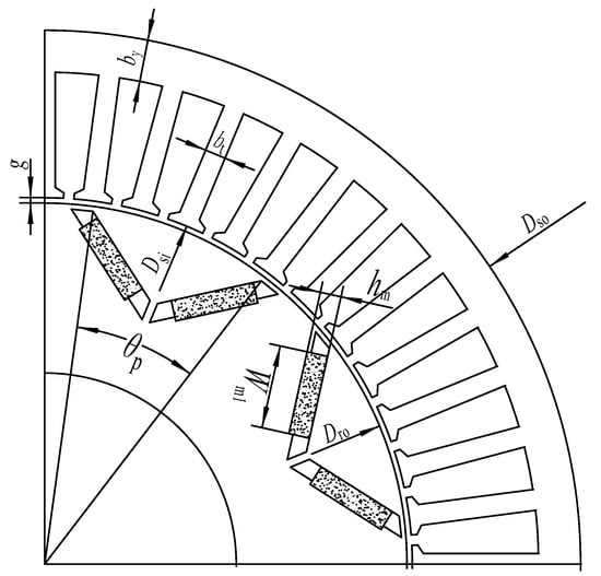 The structure of a V-Shaped IPMSM is shown in Figure 1. In order to reduce the probability of size interference between electrical motor design parameters, a proportional parametric model is established. The design parameters of the proportional parametric model are shown in Table 1. Dso is the stator outer diameter, Dsi is the stator inner diameter, Dro is the rotor outer diameter, Q is the slot number, p represents the pole pairs, g is the air gap length, bt is the tooth width of the stator, by is the yoke height of the stator, hm is the magnet thickness, Wm is the magnet width, θp is the pole arc angle, and Ls is the iron core length.