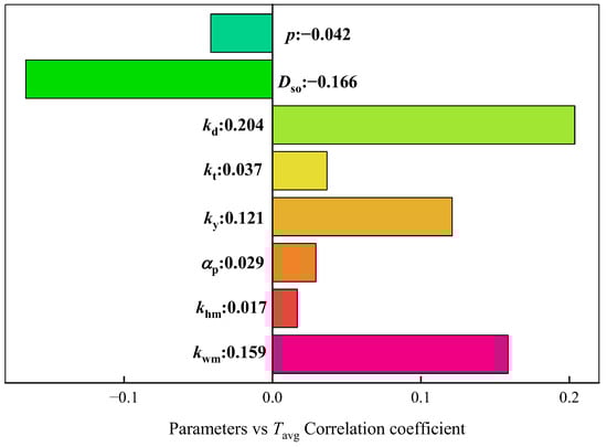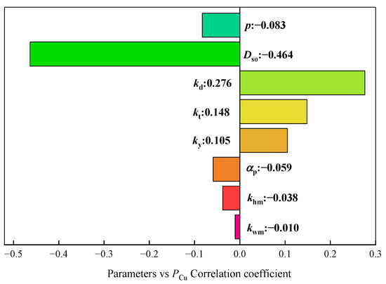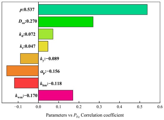 Obviously, the excitation parameters must have a strong correlation with the response results. Greater attention is given to the relationship between structure parameters and response results. Therefore, the Pearson correlation analysis is used to analyze the sensitivity between structure parameters and response results. Figure 2 shows the sensitivity between the structure parameters and PCu, Figure 3 shows the sensitivity between the structure parameters and PFe, and Figure 4 shows the sensitivity between the structure parameters and Tavg. The plus sign represents a parameter that has a positive influence on the response result, and the minus sign represents a parameter that has a negative influence on the response result. The absolute value of the coefficient represents the strength of the correlation.
