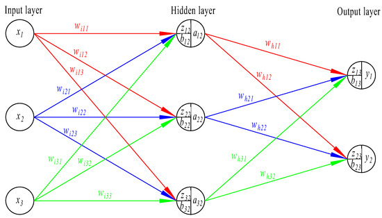 x1~x3 are variables of the input layer; wi11~wi33 represent the weight factors from the input layer to the hidden layer; z12, z22, and z32 represent the weighted input variables of the hidden layer; b12, b23, and b32 are the biases of the hidden layer; a12, a22, and a32 represent the output variables of the hidden layer; wh11~wh32 represent the weight factors from the hidden layer to the output layer; z13 and z23 represent the weighted input variables of the output layer; b13 and b23 are the biases of the output layer; and y1 and y2 are output objectives.