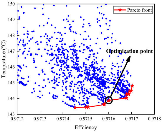 The optimization results are depicted in Figure 6, where the red line with stars represents the Pareto front. To trade off the efficiency of the electrical motor and temperature of armature winding, the optimal result should be selected from the middle position of the Pareto frontier. The point indicated with the arrow is selected as the final optimization result.