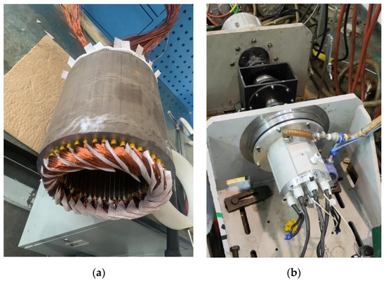 Photos of the electrical motor: (a) stator assembly photo; (b) experiment with the prototype of the electrical motor.