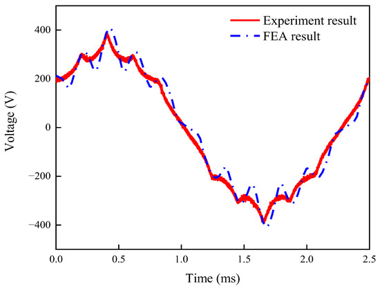 A comparison of no-load back-EMF at 6000 r/min between the experimental and FEA results is shown in Figure 8. The root-mean-square value (RMS) of the experimental model is 230.29 V, and the RMS of FEA is 229.68 V. The error between them is 0.27%.