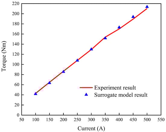 The average torque versus amplitude currents of the experimental and surrogate models are compared in Figure 9. The rated torque appears at 450 A. The average torque of the experimental model is 189.5 Nm, and the average torque of the surrogate model is 193.8 Nm. The error between them is 2.27%.