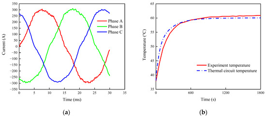 Two load tests were conducted. The first test’s load condition was set to 500 r/min, and the amplitude of the phase current was set to 300 A. The thermal test time was set as 1800 s. The three-phase current waveforms are shown in Figure 10a, and the maximum temperatures of the experiment, acquired by the thermal circuit method using MotorCAD, are compared in Figure 10b. The temperature curves stabilize around 600 s. The final temperature of the experiment is 60.9 °C, while the temperature calculated by the thermal circuit is 60.0 °C, resulting in an error of 1.5%.