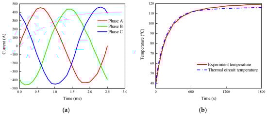The second test’s load condition was set to 6000 r/min, and the amplitude of the phase current was set as 450 A. The thermal test time was set as 1800 s. The three-phase current waveforms are shown in Figure 11a, and the maximum temperatures obtained from the experiment and the thermal circuit method using MotorCAD are compared in Figure 11b. The final temperature of the experiment is 119.2 °C, while the final temperature calculated by the thermal circuit is 116.0 °C, resulting in an error of 2.76%.