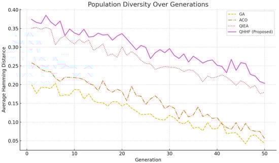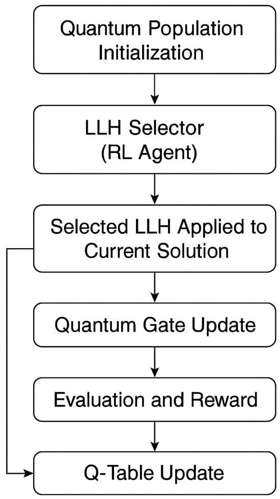 Recent advances in reinforcement learning-based hyperheuristics have extended the capabilities of traditional rule-based frameworks. Deep Q-Network (DQN)-based selectors and policy-gradient approaches have been applied to dynamic scheduling and vehicle routing tasks [43,44,45]. These frameworks learn over state–action pairs and dynamically update their policies to improve heuristic decisions. Our QHHF model follows this trend but introduces a quantum-inspired initialization and evolution scheme, enhancing population diversity and exploration.