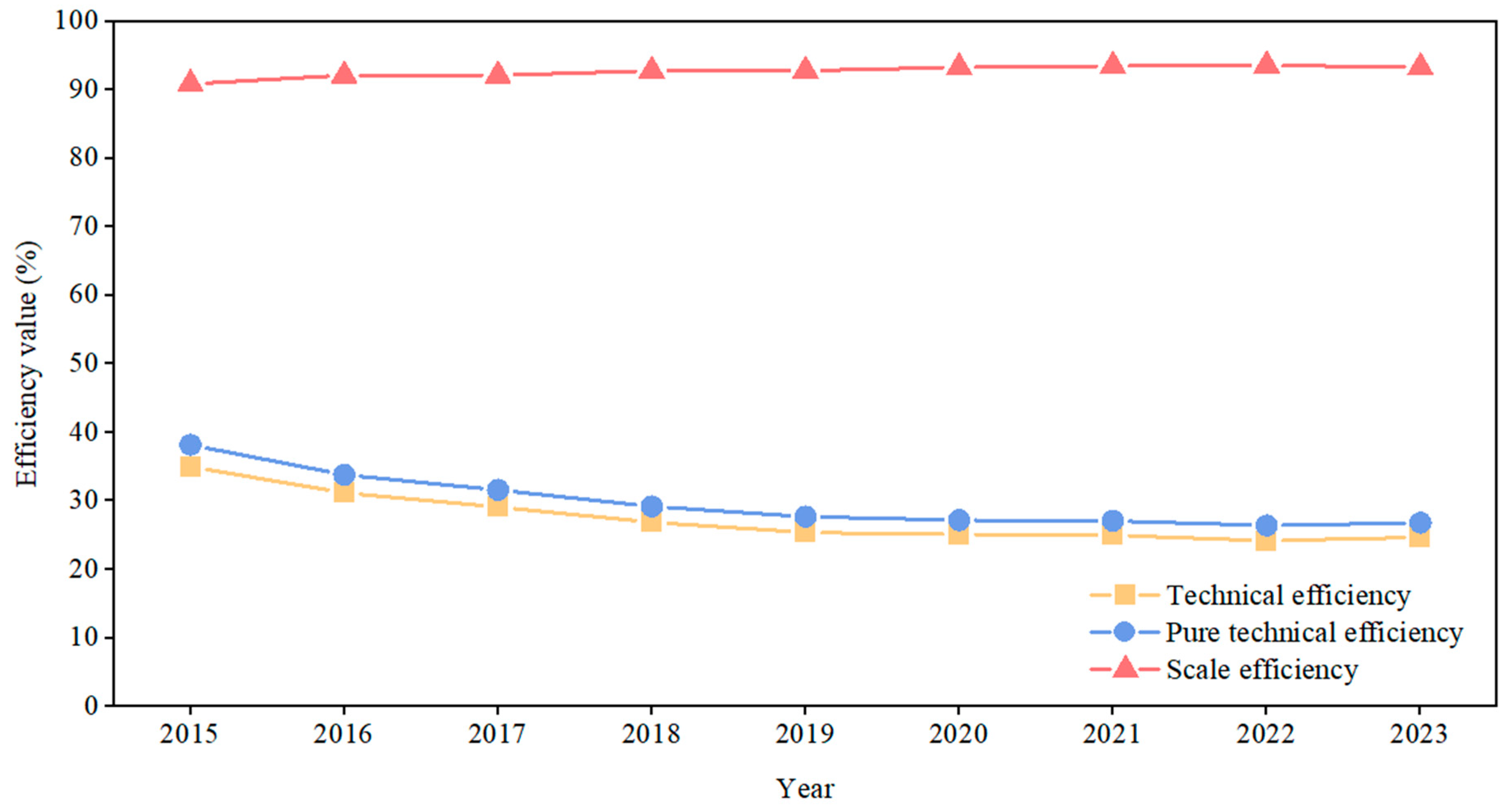 | Year | Technical Efficiency | Pure Technical Efficiency | Scale Efficiency | Technical Efficiency | Pure Technical Efficiency | Scale Efficiency |