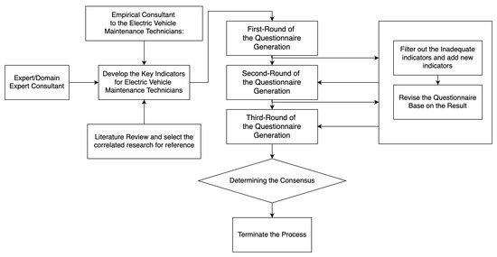 We adopted a mixed-methods research design to develop and validate a competency framework tailored to electric small-passenger car maintenance technicians. The overall approach integrated qualitative and quantitative techniques, beginning with an exhaustive review of the academic literature, industry reports, and international and domestic standards related to electric vehicle maintenance. The initial phase focused on identifying and categorizing relevant competency areas, while the subsequent phases were devoted to expert consensus-building. The framework is hierarchically organized into three layers: core dimensions, sub-dimensions, and specific indicators. This structured design not only facilitates a comprehensive evaluation of both technical and non-technical skills but also ensures that the final model reflects the complex requirements of the evolving BEV maintenance industry. By employing a rigorous Delphi method, the research design provided a systematic procedure for refining and validating the competencies, thereby enhancing the credibility and practical applicability of the framework.