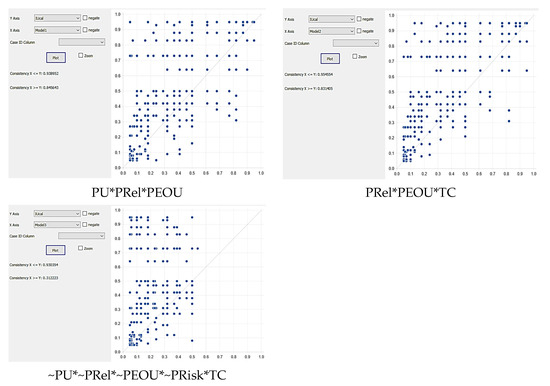 The analysis of necessity identifies key conditions essential for having a high or low intention to use self-driving vehicles. According to [70], a condition is deemed necessary if its consistency score is >0.90. Consistency measures how consistently the outcome aligns with the presence of a condition, while coverage evaluates the condition’s empirical relevance.