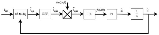 where and represent the amplitude and frequency of the injected voltage, respectively. By applying the rotational matrix in Equation (5) to the estimated synchronous reference frame, the current response in the estimated d–q axis can be expressed as follows: