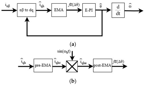 Since the rotor position error contains both AC and DC components resulting from the synchronous demodulation process, the second-stage EMA, referred to as the post-EMA, is applied to suppress the AC component as a replacement for the conventional LPF. Accordingly, the rotor position estimation error can be expressed by rewriting Equation (13) as follows:
