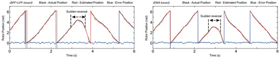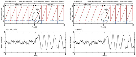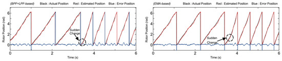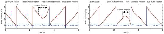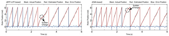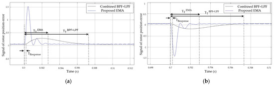 Performance comparison between combined BPF+LPF-based and EMA-based methods in the extraction scheme. (a) The input signals representing the rotor position error changed abruptly at 0.5 s. (b) The input signals representing the rotor position error changed abruptly at 0.7 s.