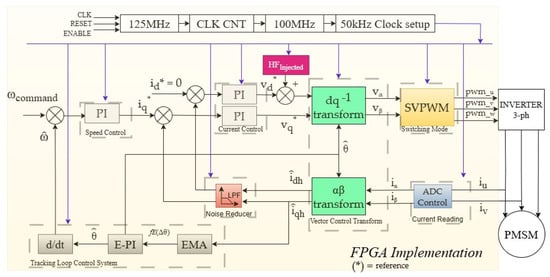In order to realize the proposed sensorless scheme, an FPGA is selected. Due to its capability in hardware control implementation, which enables parallel processing and fast execution, a wider control-loop bandwidth can be achieved. This is beneficial for minimizing delays that may occur in the sensorless control process, such as ADC control, vector control, the estimation process, and filtering, as shown in Figure 4.