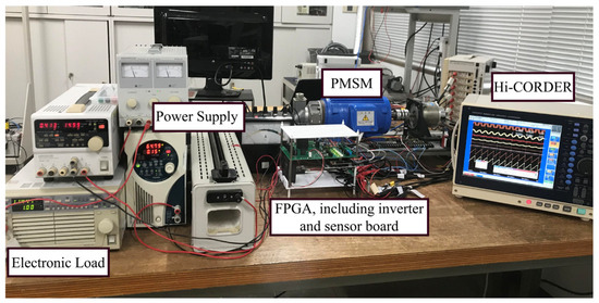 In this section, the experimental setup was conducted to verify the effectiveness of the proposed position sensorless control strategy through a series of tests. The experimental apparatus, shown in Figure 5, consists of a PMSM, a designed inverter board with a sensor module, an FPGA board, a DC power supply, and an electronic load. The electrical parameters of the PMSM are listed in Table 3. An encoder was used to evaluate the accuracy of the estimation results by monitoring the actual position and speed. Furthermore, the control bandwidth was set to 50 kHz, and the PWM switching frequency was 20 kHz. In this sensorless strategy, the injection frequency was set to 1 kHz with an amplitude of 5 V. In addition, the cut-off frequencies of the BPF were 900 Hz and 1.1 kHz, while the cut-off frequency of the LPF was 100 Hz in the conventional extraction scheme. Meanwhile, the α for the proposed EMA-based scheme is described in Section 3.