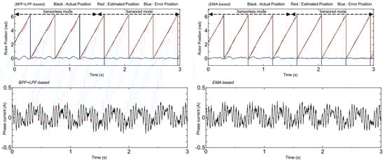 In this case, the AC component introduces a specific frequency into the rotor position error. To eliminate this component, the window length can be set to the lower limit at 50 Hz, which corresponds to a window length of 0.02 s, resulting in a post-EMA smoothing factor of 0.001. Accordingly, the post-EMA is employed to extract the DC component by calculating the average values within the defined window length. Thus, rotor position information can be expressed by rewriting Equation (21) as follows: