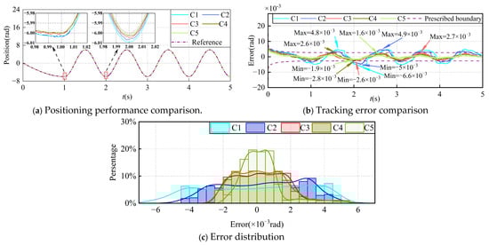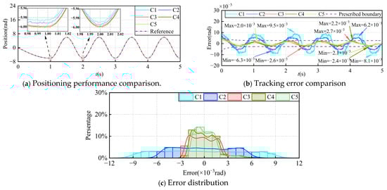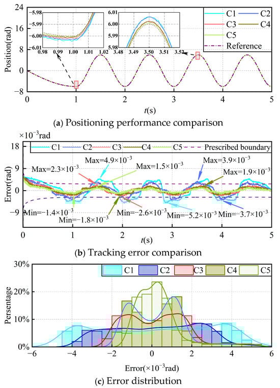 (3) Experimental comparisons show that PP-MFA-FITSMC outperforms other methods with faster convergence and no overshoot. In the presence of load disturbances and measurement noise, the tracking error of PP-MFA-FITSMC remains largely confined within ±0.001 rad, while the tracking errors of the other methods are more dispersed. This indicates that the proposed method effectively improves both the dynamic and steady-state performance and robustness of the PMSM position servo system.