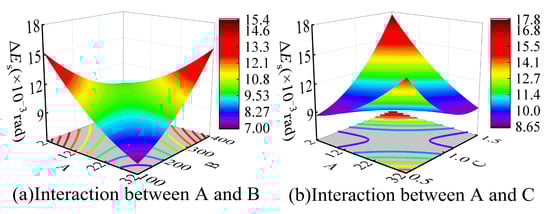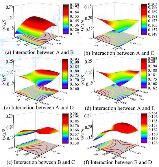 The analysis demonstrates that the model’s null hypothesis probability p = 0.0342 < 0.05 indicates statistically significant influencing factors, while the lack-of-fit term’s probability p = 0.3324 > 0.05 confirms its statistical insignificance. The model’s overall significance is evidenced by an F-value of 2.22, calculated as the ratio of the factor mean square to the error mean square, with individual factor F-values ranking as FE = 6.14 > FC = 1.83 > FB = 1.31 > FA = 1.06 > FD = 0.0912, revealing their relative influence on the steady-state error range in descending order. An interaction analysis conducted via Design-Expert generated three-dimensional response surface plots shown in Figure 5, illustrating pairwise variable interactions. As shown in Figure 5, the interaction between parameters A and C constitutes the dominant factor affecting the steady-state error range, while the interaction between B and D exhibits the least influence. When steady-state error serves as the response variable, the effects of individual independent variables follow the same analytical methodology as demonstrated in Figure 4.