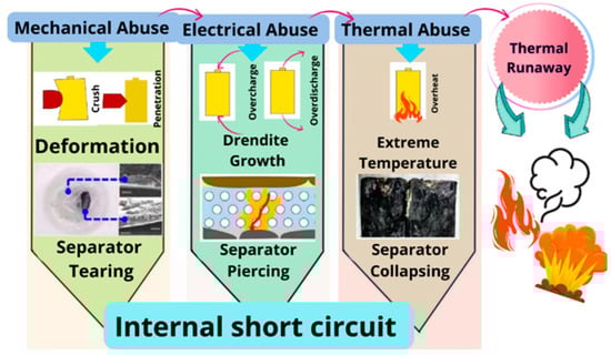 In recent years, electric vehicles have established themselves as an excellent option for reducing greenhouse gases and dependence on fossil fuels. Lithium-ion batteries are the main element in electric vehicles. However, a disadvantage of this type of battery is that it requires proper thermal management to ensure its optimal performance, durability, and safety. Figure 1 illustrates some of the causes of a thermal runaway and its physical characteristics that may occur during a short circuit, such as smoke, fire, or even an explosion.