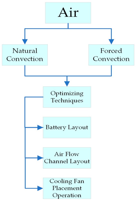 There are two types of configurations for introducing air to the battery pack: natural convection and forced convection. Below is a brief explanation of both air-cooling configurations. A diagram illustrating the various air-cooling configurations is shown in Figure 8.