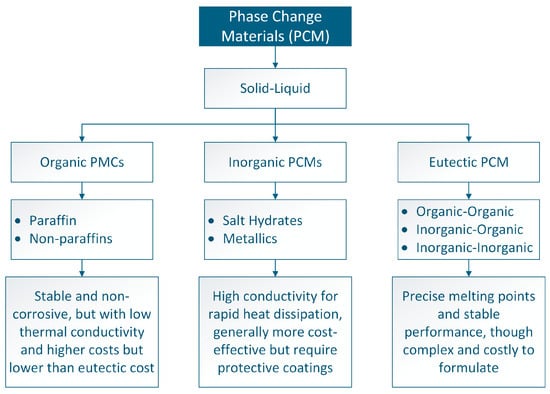 Phase change material (PCM) cooling for electric vehicle (EV) battery packs can be divided into three main types: organic, inorganic, and eutectic PCMs. Organic PCMs, such as paraffin-based materials, provide passive thermal regulation, ensuring stability and non-corrosiveness, but they require thermal conductivity enhancers for effective heat dissipation. Inorganic PCMs, including salt hydrates, exhibit higher thermal conductivity and latent heat storage, making them suitable for rapid heat dissipation; however, they may need protective coatings to prevent corrosion. Eutectic PCMs, formed by combining organic and inorganic components, offer precise thermal control with tailored melting points, optimizing battery reliability under varying load conditions. Although their complex formulation often increases costs, these PCMs can enhance battery efficiency, prevent thermal runaway, and contribute to the longevity of EV battery systems. Figure 9 illustrates the classification of PCMs, along with a summary of their advantages and disadvantages.