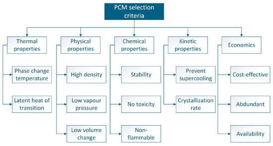 The selection of phase change materials (PCMs) is based on thermal, physical, chemical, kinetic, and economic criteria. It is essential to consider the transition temperature and latent heat for thermal efficiency. Structural properties must allow integration without affecting system stability. Operational safety depends on chemical stability and the absence of toxicity or flammability. In addition, factors such as crystallization and prevention of supercooling ensure reliable performance. Finally, availability and cost-effectiveness determine their viability in industrial and commercial applications. With this evaluation, it is possible to choose PCMs that optimize the thermal management of the systems in which they are implemented. Figure 10 provides a detailed overview of the selection criteria for the materials above.