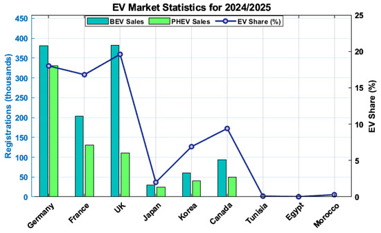 Figure 2 presents a comparative analysis of EV market statistics across nine countries for the years 2024–2025, focusing on BEV sales, PHEV sales, and the corresponding EV market share as a percentage of total new vehicle registrations. The chart reveals that Germany, the United Kingdom, and France lead in both BEV and PHEV adoption, with Germany achieving the highest number of BEV registrations (approximately 380,000) and the UK recording the largest market share (close to 20%). In contrast, Japan and Korea show moderate EV penetration, with relatively lower sales volumes and market shares, below 10%. Canada demonstrates steady progress, with a balanced mix of BEV and PHEV sales and an EV share around 10%. Notably, North African countries Tunisia, Egypt, and Morocco remain at an early stage of adoption, with minimal sales and market shares below 1%, reflecting infrastructural limitations and policy gaps. Overall, the figure underscores the global disparity in EV adoption and highlights the urgent need for supportive policies and infrastructure development in emerging markets.