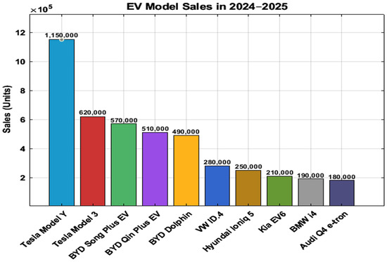 Figure 3 illustrates the global sales performance of the top electric vehicle (EV) models in the years 2024–2025. The data highlights a significant dominance by Tesla and BYD in the global EV market. The Tesla Model Y leads all models with approximately 1.15 million units sold, followed by the Tesla Model 3 with 620,000 units, reflecting Tesla’s strong brand recognition, wide market reach, and consistent production scale. Chinese manufacturer BYD occupies the next three positions with its Song Plus EV (570,000 units), Qin Plus EV (510,000 units), and Dolphin (490,000 units), showcasing the company’s rapid rise and competitiveness in both domestic and international markets. In the mid-range, the Volkswagen ID.4 recorded 280,000 units, followed by the Hyundai Ioniq 5 (250,000), Kia EV6 (210,000), BMW i4 (190,000), and Audi Q4 e-tron (180,000), indicating solid sales performance among established European and Korean automakers. This figure underscores a market trend where Tesla and BYD dominate the EV sector, while legacy manufacturers are gradually scaling their production and adoption rates. The strong presence of BYD models further emphasizes China’s pivotal role in the global transition to electric mobility.