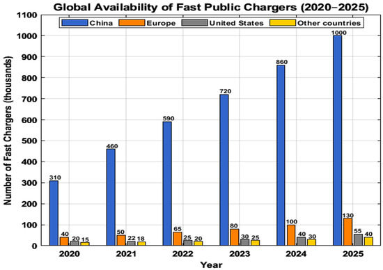 Figure 4 presents the evolution of the global availability of fast public EV chargers between 2020 and 2025, highlighting regional disparities and growth trajectories in charging infrastructure. The data shows that China leads the world by a considerable margin, with the number of fast chargers increasing from 310,000 in 2020 to a projected 1,000,000 units in 2025, indicating a strong national policy emphasis on charging accessibility and EV support infrastructure. In contrast, Europe exhibits steady growth, from 40,000 chargers in 2020 to 130,000 in 2025, reflecting coordinated EU efforts to meet the rising demand for electrified transport. The United States shows moderate progress, growing from 20,000 to 55,000 chargers over the same period, which suggests that while EV adoption is increasing, infrastructure expansion is comparatively lagging. Other countries, a category representing regions outside the top three, have doubled their charger counts from 15,000 in 2020 to 40,000 in 2025, showing a slower but positive trend in global electrification. Overall, the figure underscores a global acceleration in fast charger deployment, driven primarily by China, with other regions scaling up efforts at varying rates. It also emphasizes the critical importance of infrastructure development in supporting the broader transition to electric mobility, especially in regions still at early stages of EV market maturity.