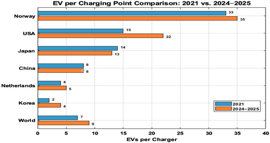 EV per charging point comparaison 2021 vs. 2024–2025 [82].