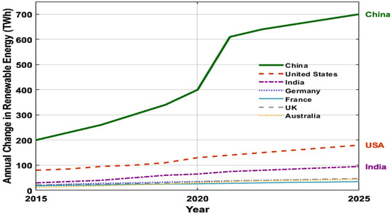 The following regards the annual increase in RES genration, measured in terawatt-hours (TWhs), across seven major countries between 2015 and 2025. The data reveals a remarkable acceleration in renewable energy development, particularly in China, which stands out as the global leader. China’s renewable generation increases steadily from around 200 TWh in 2015 to 500 TWh in 2020, followed by a dramatic leap to over 600 TWh in 2021 and a continued upward trend reaching 700 TWh by 2025. This significant expansion reflects China’s aggressive national policies, large-scale solar and wind deployments, and grid modernization efforts. The United States follows as the second-largest contributor, with a consistent and moderate growth from approximately 80 TWh in 2015 to around 140 TWh in 2025, indicating a steady investment in renewables, particularly in wind and solar power. India also shows positive momentum, increasing from 30 TWh to nearly 100 TWh, underscoring its growing commitment to decarbonization despite infrastructure and policy challenges. Meanwhile, Germany, France, the United Kingdom, and Australia contribute more modestly, with their annual changes ranging between 30 and 70 TWh by 2025. These countries demonstrate stable progress, aligned with their long-term sustainability strategies and regional decarbonization targets. Overall, the figure highlights the global disparity in renewable energy growth, with China taking a commanding lead, followed by progressive but uneven developments in other regions. It underscores the urgent need for accelerated investments and international cooperation to achieve a balanced and effective global energy transition.