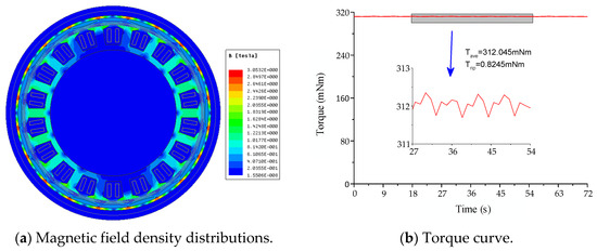 In the analysis of the Halbach-type motor under locked rotor conditions with three-phase sinusoidal currents, the motor’s magnetic flux distribution, torque characteristics, voltage–current relations, and radial air-gap magnetic field distribution were computed, as depicted in Figure 9. The analysis also investigates the motor’s electromagnetic losses, efficiency, and thermal performance under continuous stall conditions, which are critical for optimizing motor design for prolonged operation in industrial applications.