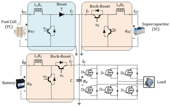 EVs utilize multiple energy storage devices (ESDs), including fuel cells (FCs), batteries, and super-capacitors (SCs), to meet diverse power demands. The fuel cell offers high efficiency with zero emissions but suffers from a slow transient response and voltage fluctuations, requiring DC–DC converters for regulation. Batteries provide high energy density but degrade over time, requiring efficient power management to prevent overcharging and extend the lifespan [6]. Meanwhile, super-capacitors excel in rapid charge–discharge cycles and handling sudden power surges, making them ideal for regenerative breaking, though their long-term energy storage is not optimal. A hybrid combination of FCs, batteries, and super-capacitors is essential to maximize efficiency and ensure reliable EV performance [7]. EVs integrate various energy storage devices (ESDs), such as FCs, batteries, and super-capacitors, connected through different types of power electronic converters to ensure efficient power delivery. Generally, ESDs are charged via the grid or charging stations using converters and subsequently supply the required energy to traction motors. However, ESDs exhibit nonlinear power behavior, voltage fluctuations, and considerable voltage drops, leading to power instability [5]. DC–DC converters contribute a crucial role in regulating the power flow, but their design is challenging due to dependencies on the voltage of the input side, the duty ratio, and load parameters. Additionally, these converters exhibit nonlinear behavior and lightly damped dynamics due to switching actions and complicated power-sharing and energy management. The complex interactions among power-producing units, power-processing units, and power-consuming units further impact system stability and performance, especially under varying driving conditions.