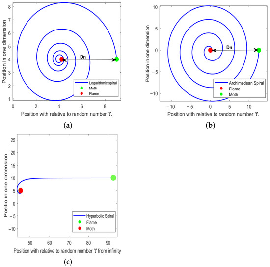 In Equation (57), represents the linear distance that separates the nth moth and the nth flame, where a denotes the shape factor of the logarithmic spiral, and t is a random variable ranging from to 1. The logarithmic spiral function underpins the balance between exploration and exploitation, as moths constantly adjust their locations in relation to flames by circling them. Exploration transpires when the continuous movement of the agent remains external to the search space for the moth along with the flame, while exploitation occurs when the movement of the agent is contained inside the search space. The randomly generated t signifies the extent to which the accelerated positions of moths approach flames.