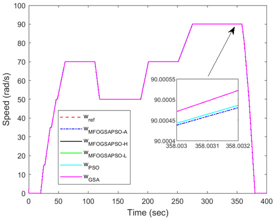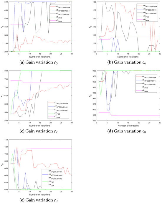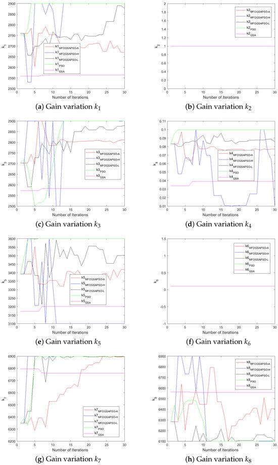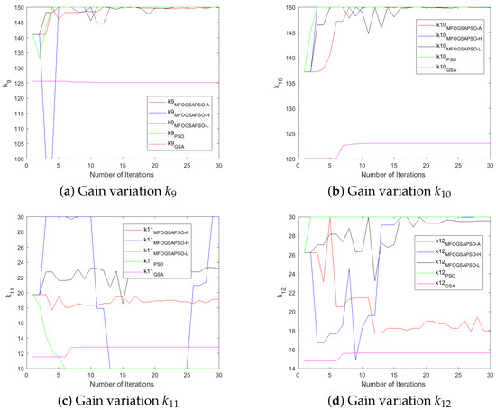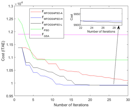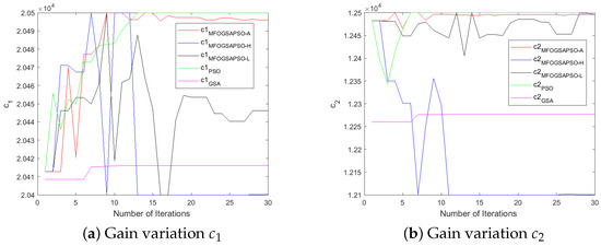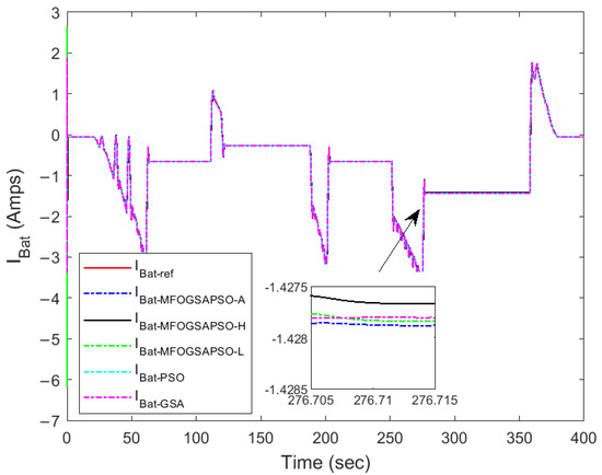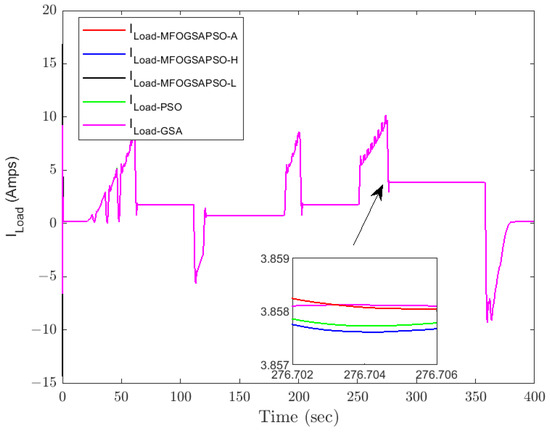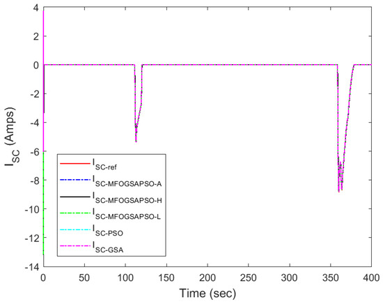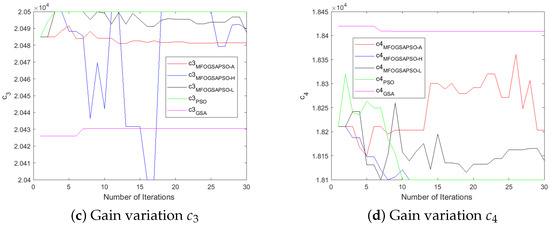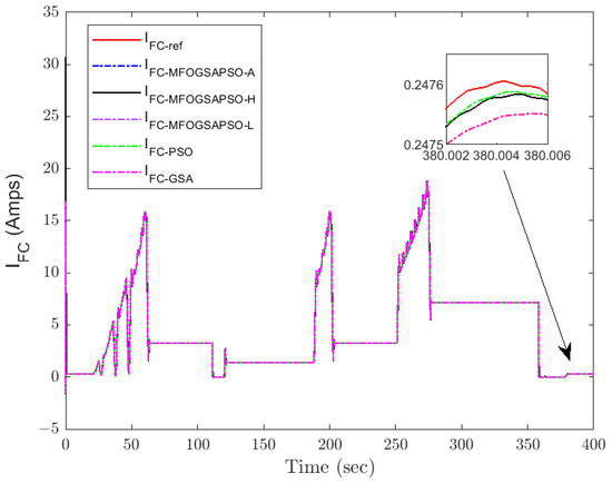 Meanwhile, the GSA-assisted () method combines the stochastic nature of MFO with the gravitational search principles of GSA, leading to improved exploration and exploitation capabilities. These algorithms were chosen based on criteria including search diversity, convergence stability, and suitability for high-dimensional controller tuning. Furthermore, our literature review confirmed that this specific MFOPSOGSA hybrid has not been previously applied to FCHEV control systems, making our approach both novel and well founded. Similarly, the proposed MFO variants are compared with GSA and PSO techniques, and a detailed discussion is given in Section 7.