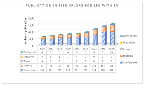 Number of publications in IEEE Xplore for load frequency control and electric vehicles (2016–2024).