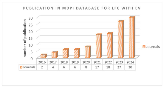 Number of publications in MDPI database for load frequency control and electric vehicles (2016–2024).