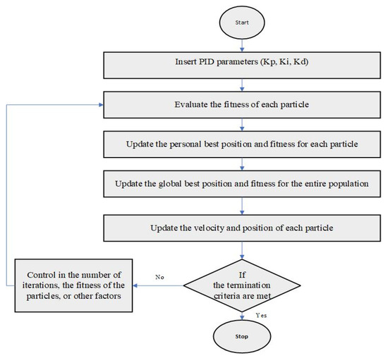 A PID controller’s parameters must be tuned in order to produce the desired performance. There are several approaches available for this aim, and each has pros and cons of its own. The Ziegler–Nichols approach, the Cohen–Coon method, the trial-and-error method and optimization techniques are some of the commonly employed strategies [22,25]. Several factors, including system complexity, resource availability, and required performance standards, play a role in the tuning method selection process. Although optimization techniques are very accurate, they are also typically more complicated. These methods apply mathematical optimization techniques to determine the optimal values of the PID parameters. In order to obtain better control performance and efficiency, the PID controller used by the EV station is optimized in this research using Particle Swarm Optimization (PSO).
