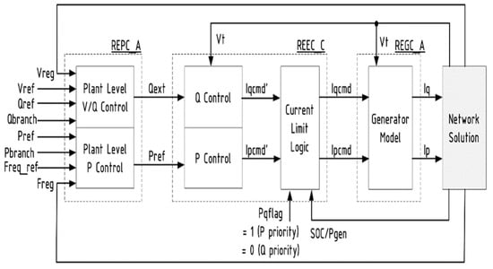 It should be noted that the Second-Generation Generic Model (SGGM) is primarily applicable to steady-state positive sequence analysis [33] and has been officially approved for utilization in WECC studies. To provide a visual representation, Figure 5 depicts the schematic structure of the SGGM [34]. The PSSE software has a Second-Generation Generic Model (SGGM) that comprises three primary modules: the renewable energy generator/convertor module version A (REGC_A), the renewable energy electrical control module version C (REEC_C), and the renewable energy plant control module version A (REPC_A) [8]. These three modules are employed to model the dynamic characteristics of EV fast charging stations since they are typically used to emulate the energy storage system dynamic behavior in PSSE; the only difference is to modify the power flow data in the EV station as a negative generation. Hence, the dynamic modeling of the EV fast charging station is based on the dynamic modeling of the energy storage system used in PSSE.