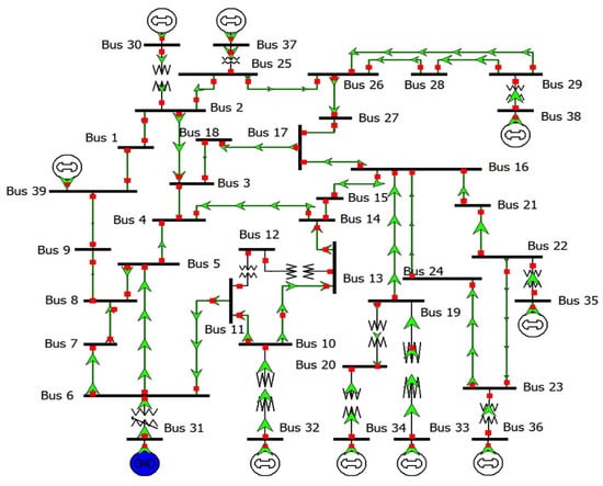 In order to apply the proposed location model to a larger transmission network, the IEEE 39 test system was selected. It has 10 generator machines, 46 branches, and 19 loads. The overall generation capacity of the system is 6298 MW, where the total load connected is 6097 MW (Figure 7).