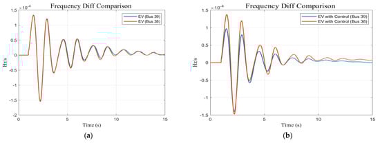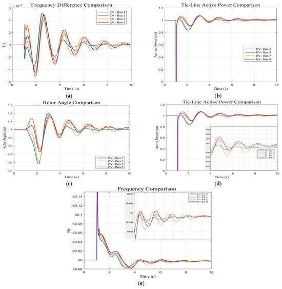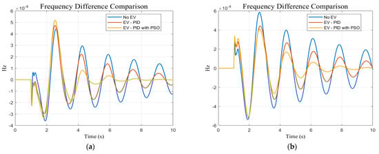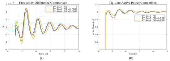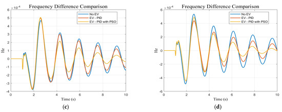 A typical PID controller and a base case scenario with no control input for each EV station placement bus were compared in the first comparison to examine the performance of utilizing a PID controller with the PSO model for EV stations. The frequency difference response comparison for the chosen four buses, Buses 1, 3, 7, and 9, with the EV station installed is shown in Figure 8a–d. The findings unequivocally show that in comparison to the other scenarios, the PID controller with PSO greatly enhances the dominant oscillation mode’s damping.