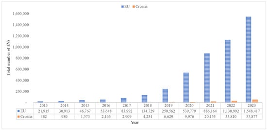 Comparison of total EVs registered in EU and Croatia in 2013–2023.