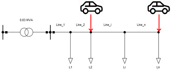 This work used a model of a real grid (Figure 3)—a distribution low-voltage feeder with a load characteristic of a household. Given that it was a rural feeder, the assumption was that there would be no integrated rooftop PV power plants and that it would not affect the voltage conditions on the feeder. In addition, charging took place during the night; so, the possible integration of the rooftop PV plants would not have an impact on the voltage conditions. Charging at night was considered for two key reasons: