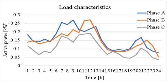 The test grid was modeled with 90 households evenly distributed along the feeder with a three-phase unbalanced load and a peak power of each household of approximately 0.8 kW. The feeder was connected to the distribution grid via a 10/0.4 kV transformer with 0.63 MVA apparent power. The load characteristics were obtained by measurement for a normal working day and are shown in Figure 4.
