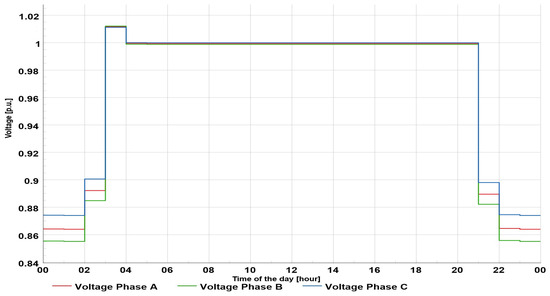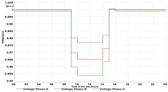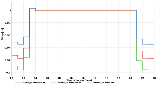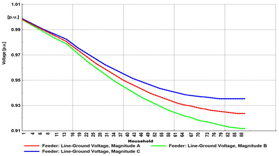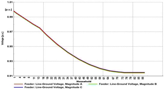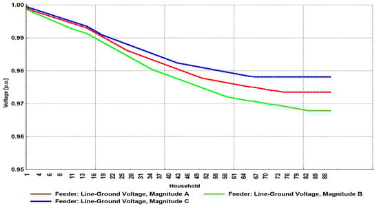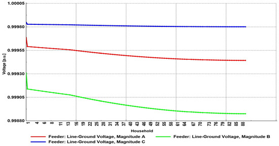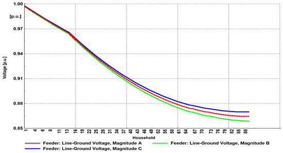 Considering the voltage profile at the end user located on bus 90 (Figure 16), the voltage unbalance was more pronounced than in Scenario 2. In this scenario, the lowest voltage was in phase B (value of 0.91 p.u.), which is in accordance with the values of the feeder’s voltage profile.