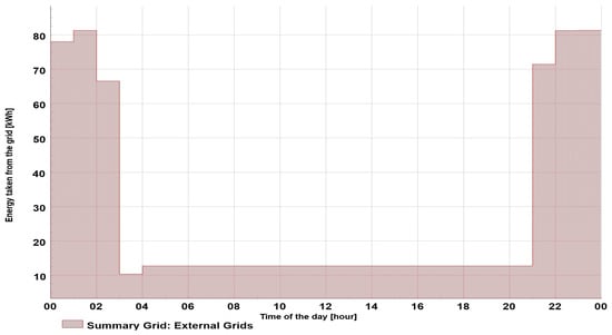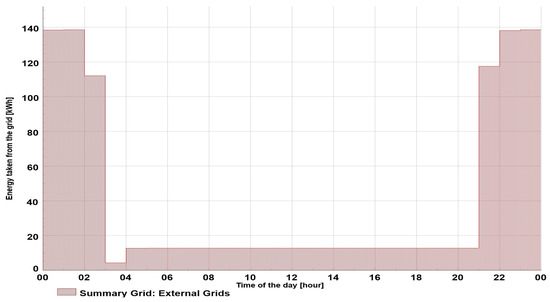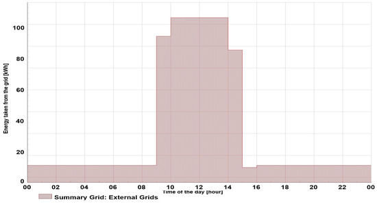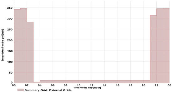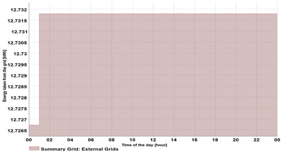 Since all the consumers had a similar load pattern, the load curve and energy exchange during the day were constant (Figure 6). The maximum load was around 12.5 kW, resulting in approximately 300 kWh of energy taken from the grid during the 24 h period.
