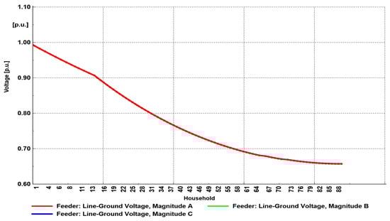 Similar to Scenario 2, in Scenario 3 it was assumed here that the integration of EV chargers would be according to the projections and expectations about the share of EVs. Accordingly, it was assumed that every second household would have a balanced three-phase EV charger with a power of 11 kW. The number of chargers remained the same as in the previous scenario (44 chargers). The voltage profile is shown in Figure 11, and it can be noticed that the voltage at the end user reached a value of 0.65 p.u. Since the chargers were balanced, the voltage along the feeder as also balanced.