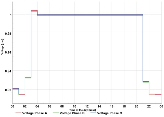 In Scenario 5, the same assumptions were used as in Scenario 4, regarding the largest number of three-phase chargers with a power of 11 kW that could be integrated on the feeder without a voltage drop below 0.9 p.u. As shown in Scenario 3, integration at the level of 50% of the households with EVs would lead to an excessive voltage drop. Therefore, as in Scenario 4, the number of chargers was reduced, and these were now symmetrical; ultimately, the total number of chargers that could operate simultaneously was 11, corresponding to 12.5% of the households that could have a three-phase EV charger. The voltage profile for this scenario is shown in Figure 17—the voltages were balanced, as the load was defined by the power of the EV chargers.