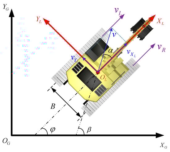 As shown in Figure 1, the robot’s motion is represented by a global coordinate system () and a local coordinate system (). The position and the orientations of the global coordinate remain constant, while the local coordinate system moves with the robot. The positive direction of the axis corresponds to the robot’s forward direction, while the positive direction of the axis is perpendicular to and points to the left side of the robot’s forward direction. v denotes the robot’s actual travel speed. The angle represents the orientation difference between the local axis and the global horizontal axis (i.e., the heading angle). The angle is the angle between the motion axis and v. The direction angle is . and represent the actual forward velocities of the left and right tracks. r denotes the effective driving radius of the tracked drive wheels, and B represents the track gauge (the lateral distance between the two tracks).